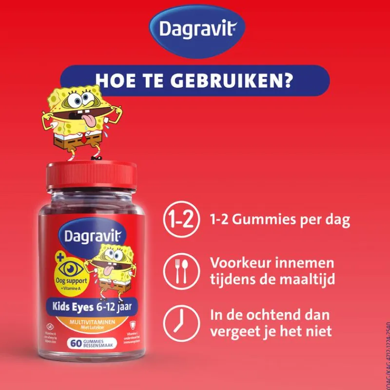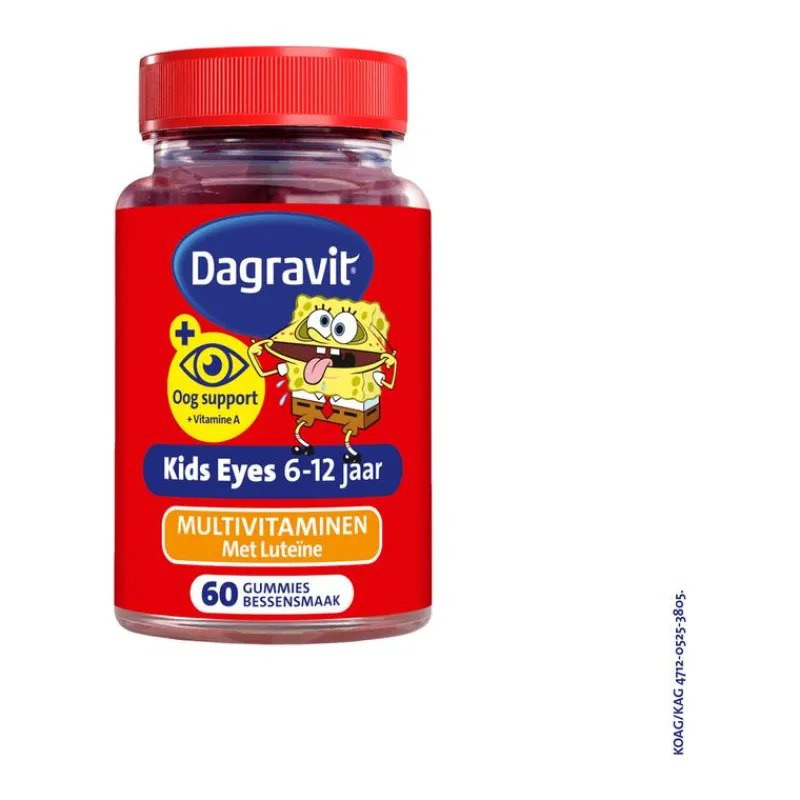 Dagravit Kids Eyes Multivitaminen gummies met oogsupport zijn speciaal voor kinderen in de leeftijd van 6 tot 12 jaar. De gummies bevatten mineralen zoals zink en jodium, maar ook luteine en vitaminen zoals vitamine A en C. Vitamine A en zink zijn goed voor het gezichtsvermogen en ondersteunt de conditie van het oog, om scherp te blijven zien. Vitamine C ondersteunt de weerstand van kinderen. De gummies zijn gluten- en lactosevrij, bevatten geen geur- en smaakstoffen en hebben een heerlijke bessensmaak. Met stoer Spongebob karakter op de verpakking.