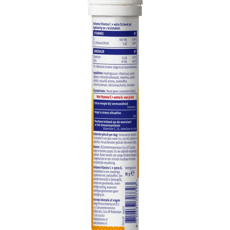 Davitamon Vitamine C Forte + extra D3 combineert een hoge dosering vitamine C (750% van de ADH) met vitamine D (200% van de ADH), selenium (100% van de ADH) en zink (100% van de ADH) in één bruistablet en is daarom: