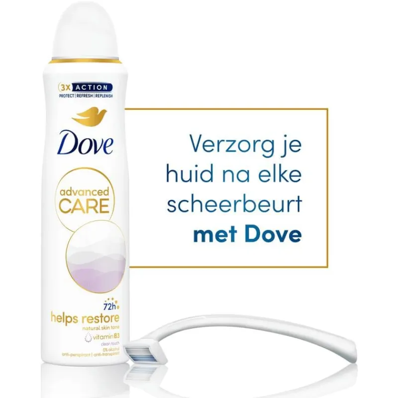 Dove Advanced Care Clean Touch Anti-Transpirant Deodorant Spray met een heerlijk frisse, schone geur beschermt tegen zweet én is lief voor je oksels. De anti-transpirant is verrijkt met Vitamine B3 en helpt de natuurlijke teint van je huid te herstellen. Het Advanced Care assortiment van Dove met de verbeterde formule met Pro-Ceramide serum maakt deel uit van de meest verzorgende lijn van Dove. De spray biedt onmiddellijke verlichting na het scheren, helpt de okselhuid te herstellen en beschermt tot 72 uur tegen zweet en lichaamsgeur. Bovendien bevat deze milde formule 0% alcohol. De hele dag een fris en verzorgd gevoel – wat de dag je ook brengt!