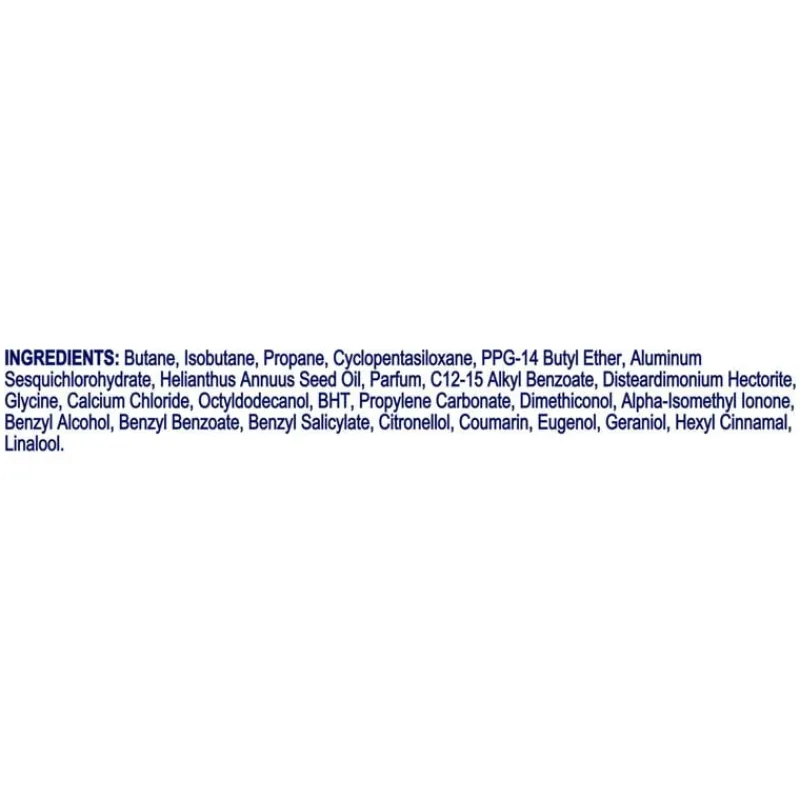 Butane, Isobutane, Propane, Cyclopentasiloxane, PPG-14 Butyl Ether, Aluminum Sesquichlorohydrate, Helianthus Annuus Seed Oil, Parfum, C12-15 Alkyl Benzoate, Disteardimonium Hectorite, Glycine, Calcium Chloride, Octyldodecanol, BHT, Propylene Carbonate, Dimethiconol, Alpha-Isomethyl Ionone, Benzyl Alcohol, Benzyl Benzoate, Benzyl Salicylate, Citronellol, Coumarin, Eugenol, Geraniol, Hexyl Cinnamal, Linalool.