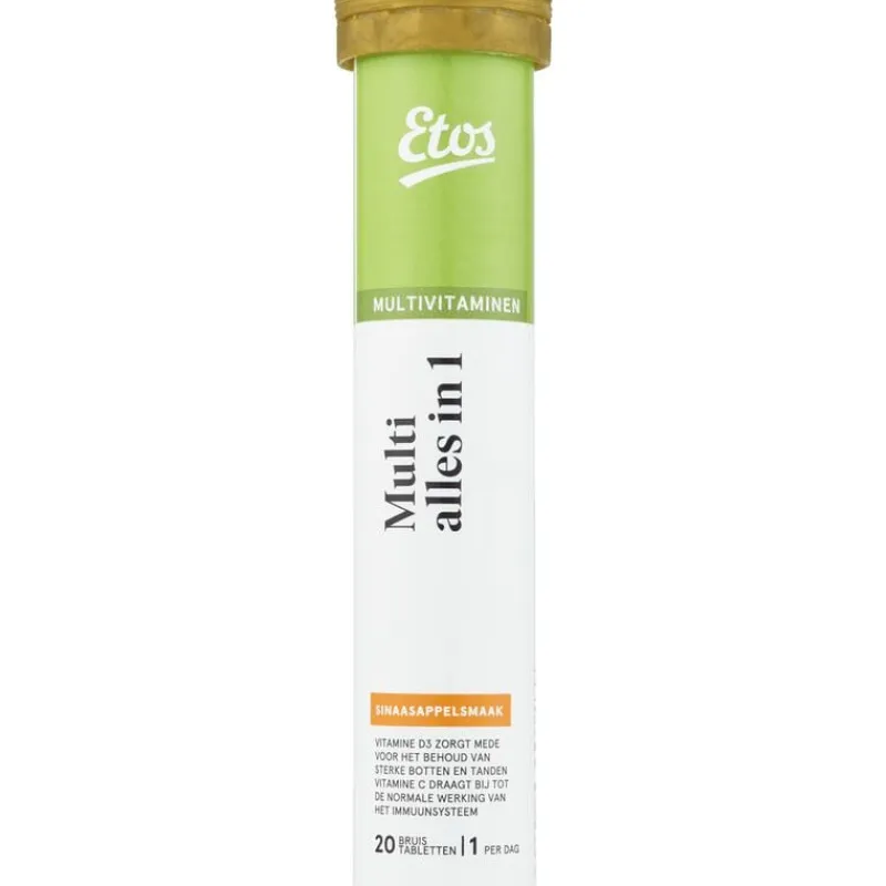 Etos Multi Alles in 1 bruisbletten bevatten vitamine C, B2, B3, B5, B6, B12 en magnesium die bijdragen aan de vermindering van vermoeidheid en moeheid.