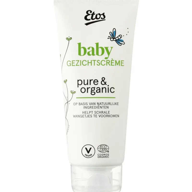 Etos Pure & Organic baby gezichtscrème speciaal voor je baby helpt het babyhuidje beschermen tegen weer en wind en helpt schrale wangetjes te voorkomen