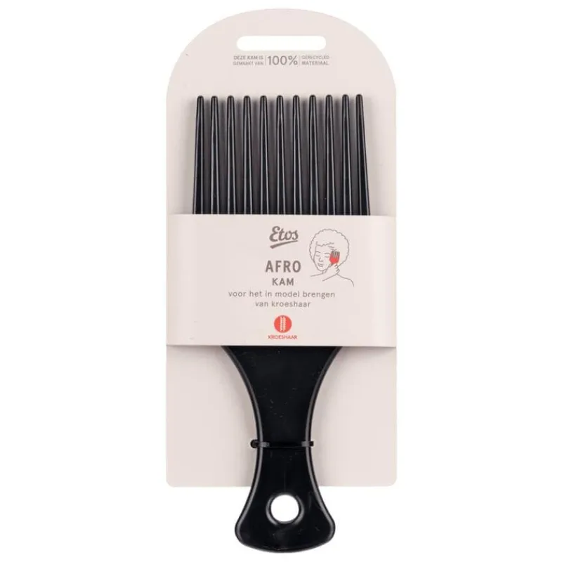 De Etos afro kam is ontworpen voor het verzorgen van krullend en kroeshaar. Deze kam heeft wijde tanden, waardoor het haar voorzichtig kan worden ontward zonder de natuurlijke textuur te verstoren. Ideaal voor het creëren van volume en het definiëren van krullen zonder frizz.