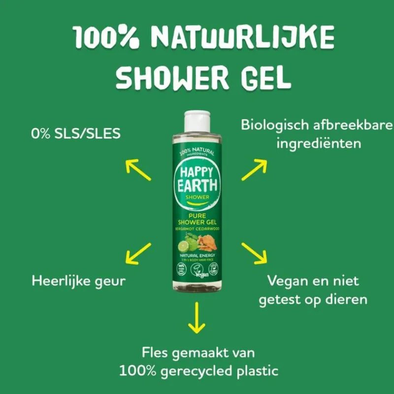 Happy Earth Pure Shower Gel Bergamot Cedarwood is een 100% natuurlijke, vegan douchegel die gemaakt is van ingrediënten waar je huid en de aarde blij van worden. Alle ingrediënten in deze douchegel zijn gecertificeerd 100% natuurlijk en hebben de Natrue en Vegan Society keurmerken. Als je iets op je huid aanbrengt en door het doucheputje spoelt, is het fijn om te weten dat er geen vervuilende en vervelende ingrediënten in zitten zoals SLS/SLES, parabenen, kleurstoffen of andere nare toevoegingen. Alle douchegels van Happy Earth zijn vrij van microplastics. Met deze shower gel zorg je goed voor jezelf en voor onze aarde!