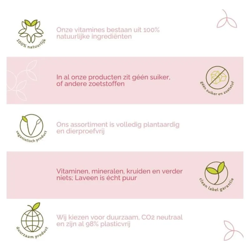Dit product wordt in Duitsland gemaakt en heeft een clean label-garantie: alle supplementen bevatten enkel pure, natuurlijke ingrediënten, zijn vrij van suiker. Alle supplementen van Laveen zijn duurzaam verpakt in donkerbruine, glazen flesjes en een doosje van karton.