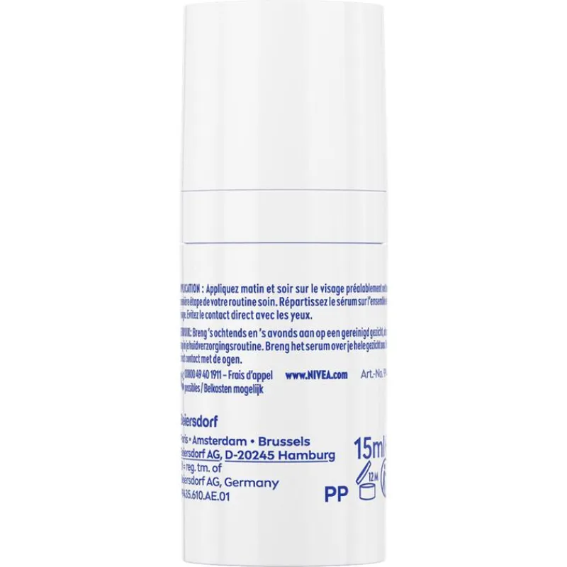 Ontdek baanbrekende huidverzorging met het NIVEA Cellular Epigenetics Serum 30ml. Dankzij de gepatenteerde Age Clock Technologie en krachtige werking van EPICELLINE® draait dit serum tot wel 10 zichtbare tekenen van huidveroudering terug in 2 weken. Klinisch bewezen resultaten tonen een vermindering van rimpelvolume (-24%), een vollere huid (+47%), meer elasticiteit (+20%) en een zichtbare glow (+20%). Verrijkt met 3 typen Hyaluronzuur, hydrateert het serum intensief (+36%) en maakt het de huid gladder, steviger en weerbaarder. Al na 1 keer gebruiken merkt 88% een stralender effect, na 7 dagen 93% een vollere huid en na 4 weken ervaart 100% een jonger uitziende huid***. De formule is klinisch getest en ontwikkeld om diep in te werken op celniveau. Kies voor het NIVEA Cellular Serum en geef je huid een krachtige boost richting jeugdige uitstraling en stevigheid. *Klinische studies, 3-43 vrouwen – zelfscore, expert score, instrumentele meting – na 2 weken. **Klinische studie met 43 vrouwen, 2 weken, 98% vertoonde tekenen van een jonger uitziende huid (verbetering van stevigheid/elasticiteit, liftend effect, uitstraling). ***Klinische studie, 43 vrouwen.