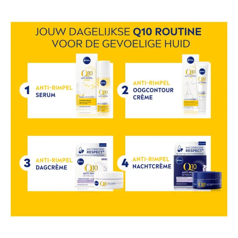 NIVEA Q10 POWER Sensitive Anti-rimpel Dagcrème is een verzachtende en verzorgende dagcrème die geschikt is voor de gevoelige huid. De speciale formule werkt niet alleen effectief tegen rimpels en fijne lijntjes, maar laat de huid ook steviger aanvoelen. Tegelijkertijd worden de drie tekenen van de gevoelige huid verminderd: roodheid, droogheid en een trekkerig gevoel. De dagcrème is parfumvrij en heeft een kalmerende werking, terwijl je ook van de bescherming van SPF 15 geniet. Zo wordt je huid beschermd tegen uv A/uv B, wat rimpelvorming helpt voorkomen, maar ook huidirritaties voorkomt. NIVEA Q10 POWER Sensitive Anti-rimpel Dagcrème bevat Q10 en creatine, die de collageenaanmaak stimuleren voor een stevigere huid en minder rimpels. Het toegevoegde zoethoutextract kalmeert en vermindert roodheid en irritatie, terwijl de formule dermatologisch is goedgekeurd. • Maakt rimpels en fijne lijntjes minder zichtbaar • Vermindert de drie tekenen van de gevoelige huid • Beschermt, voedt en verstevigt de huid • Met Q10, creatine en zoethoutextract • Met SPF 15