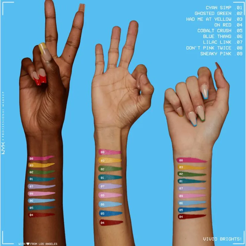 Vivid Brights Liquid Liner is zowel voor beginners als professionals. Moedig je make-up artist skills aan om eye-opening, kleurrijke looks te creëren met onze nauwkeurige eyliners. Breng subtiele accenten aan of creëer gewaagde looks met onze gladde formule die zorgzaam is met de kwetsbare huid rond je ogen! Vivid Brights Liquid Liner heeft een matte finish en een superfijne punt, dus creëer je favoriete look in een regenboog aan kleuren. Onze Vivid Brights Liquid Liner-formule geeft gelijkmatige pigmentintensiteit in één beweging, zodat jij je compleet kunt focussen op je make-up skills! Pro tip: Wees niet bang en experimenteer met de leukste ontwerpen. Met onze makkelijk aan te brengen, gepigmenteerde eyeliner creëer je de look die je wilt – stressvrij!