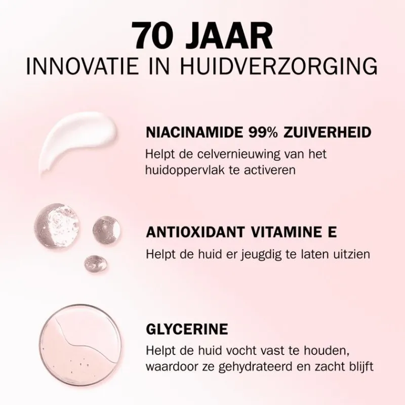 - Boordevol Niacinamide met een zuiverheid van 99% die diep doordringt in het huidoppervlak en antioxidant Vitamine E die helpt om de huid er jonger uit te laten zien