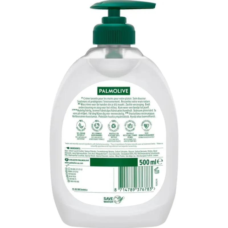 Kies voor de natuur met de dermatologisch geteste Palmolive Naturals Melk & Olijf Handzeep bevat 100% natuurlijke extracten om zowel voor je handhuid als voor de natuur te zorgen. Geschikt voor de hele familie en voor ieder huidtype, de milde en zeepvrije formule heeft naast een verzorgend effect ook een verzachtend effect dat je handen na het wassen zijdezacht laat aanvoelen. De formule van Palmolive Naturals Melk & Olijf Handzeep houdt het natuurlijke evenwicht van je handhuid in balans en bevat hydraterende melkproteïnen om je handen gevoed en gehydrateerd te houden. De natuurlijke extracten van olijven laten naast deze grondige verzorging ook een heerlijk zoete geur achter.