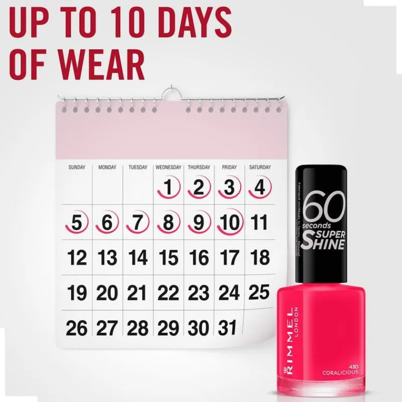 Shiny en verzorgde nagels in één minuut zijn binnen handbereik met de Rimmel London 60 seconds Supershine nagellak! Met de sneldrogende formule zijn jouw nagels snel droog. Dankzij de speciale 3-in-1 technologie zijn jouw nagels met een laag voorzien van een base coat, kleur en beschermende topcoat.