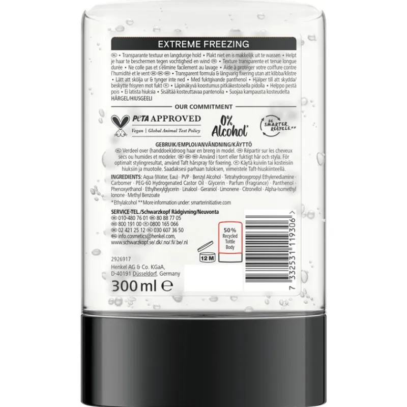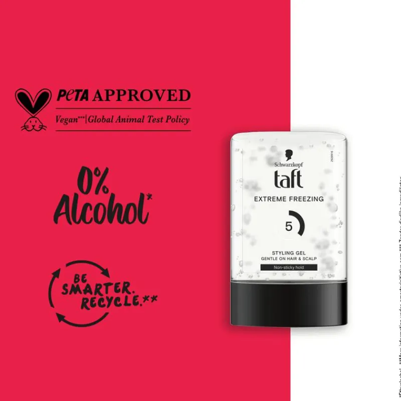 Taft Extreme Freezing Styling Gel biedt een sterke fixatie alsof je haar bevriest. De gel plakt niet, is gemakkelijk uit te wassen en bevat geen alcohol (ethylalcohol).