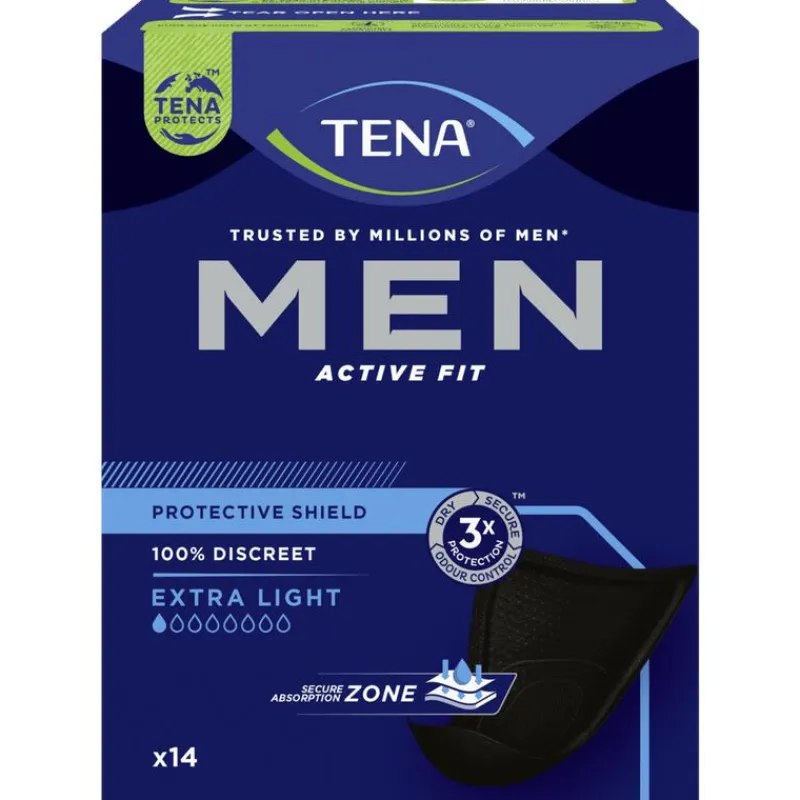 GEEN DRUPPELDRAMA’S MEER met TENA MEN ACTIVE FIT PROTECTIVE SHIELD – BESCHERMING TEGEN LICHT URINEVERLIES, geurtjes en vocht. Deze COMFORTABELE EN DISCRETE incontinentiebeschermers zijn slechts 3 MM DUN, komen in SUBTIEL ZWART en absorberen licht urineverlies voor een FRIS EN ZELFVERZEKERD GEVOEL.Speciaal ontwikkeld voor het MANNELIJKE LICHAAM, met een IETS DRIEHOEKIGE VORM en een VEILIGE ABSORPTIEZONE die vocht effectief vasthoudt. De schilden zijn apart verpakt voor GEMAK en blijven stevig op hun plek dankzij de PLAKSTRIP. Zodra het vastzit, vergeet u dat het er is.Blijf ACTIEF ZONDER ZORGEN, of u nu in de SPORTSCHOOL, op KANTOOR of onderweg bent.