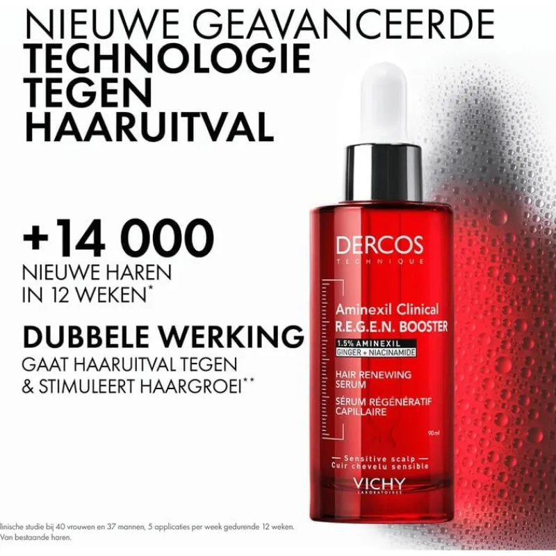 Vichy Dercos Aminexil Clinical R.E.G.E.N. Booster Serum is een geavanceerd haarserum dat haaruitval helpt verminderen en de haargroei stimuleert*. De formule combineert 1,5% Aminexil met gemberextract en niacinamide voor een dubbele werking: het ondersteunt de verankering van het haar in de hoofdhuid en bevordert een gezonde haargroei*. Het serum versterkt de haarvezel, geeft meer volume en glans, en draagt bij aan een vollere haardos. Geschikt voor dagelijks gebruik op droog of vochtig haar, voor zichtbaar sterker en vitaler haar. Vichy Dercos Aminexil Clinical R.E.G.E.N. Booster Serum biedt een gerichte aanpak bij haaruitval en dunner wordend haar. De combinatie van Aminexil, gemberwortel en niacinamide helpt de haarwortel te beschermen, stimuleert de hoofdhuid en ondersteunt de natuurlijke haargroei. Dit anti-haaruitval serum voedt en versterkt het haar vanaf de aanzet, waardoor het er voller en gezonder uitziet. Voor het beste resultaat wordt aangeraden het product 5 tot 7 keer per week aan te brengen, verdeeld over vier secties van de hoofdhuid. Ideaal in combinatie met Dercos shampoo voor een complete haarverzorgingsroutine. *Bestaand haar.