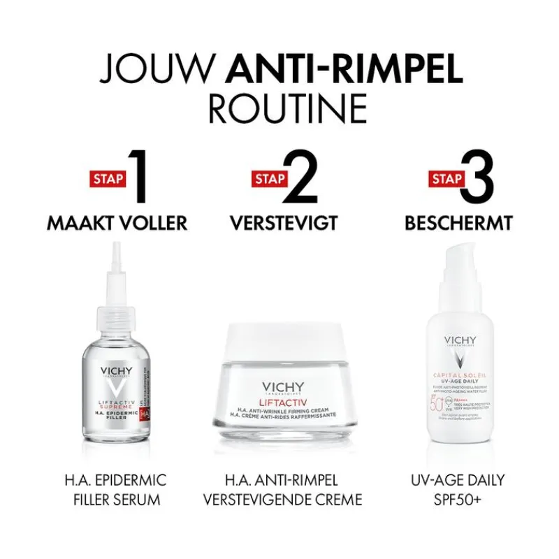 Een vermoeide uitstraling kan de huid er ‘ouder’ doen uitzien. VICHY LIFTACTIV H.A. ANTI-RIMPELS VERSTEVIGENDE CRÈME DROGE TOT ZEER DROGE HUID is ontwikkeld voor dit huidprobleem, om een doffe teint, dieper wordende rimpels en een slappere huid meteen tegen te gaan. Terwijl de uren van de dag wegtikken, wordt de huid niet vermoeider maar juist frisser van aanblik.