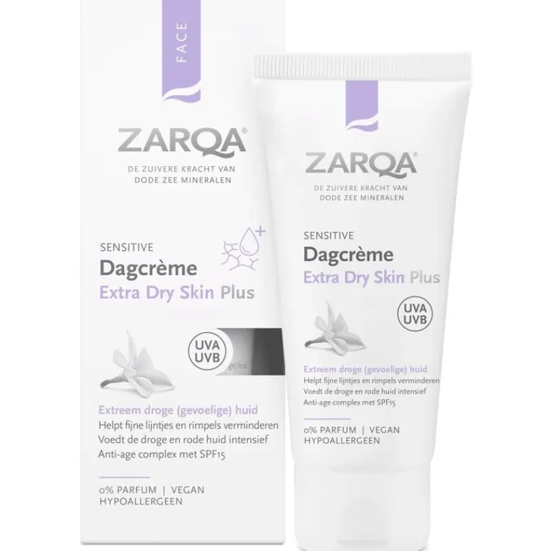 ZARQA Dagcrème Extra Dry Skin Plus – met anti-age complex en SPF15 – is een rijk hydraterende dagcrème op oliebasis, die de extreem droge (gevoelige) huid intensief beschermt, voedt en verzorgt. Dode Zee mineralen, amandelolie, magnesium en hydrocomplex met hyaluronzuur ondersteunen en beschermen op krachtige wijze tegen uitdroging en huidveroudering. De crème helpt droge huidschilfers verminderen en verzacht ruwe en schrale plekjes. Het helpt fijne lijntjes en rimpels verminderen, de droge en rode huid kalmeren en maakt de huid zacht en soepel.