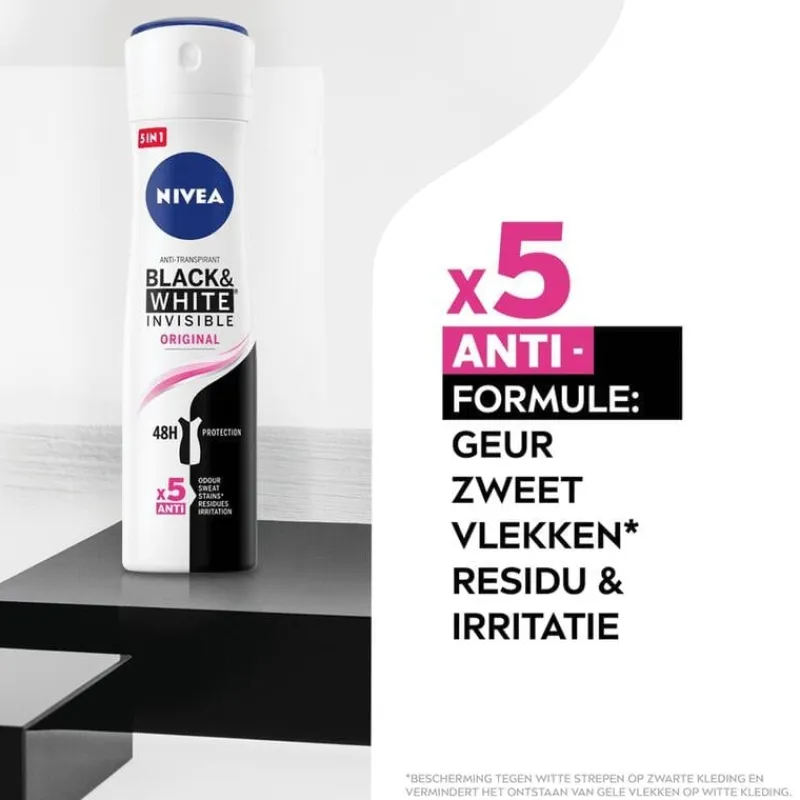 NIVEA Black & White Invisible Anti-Transpirant is de ideale keuze voor de vrouw die op zoek is naar effectieve bescherming én zorg voor haar kleding. Deze anti-transpirant is ontwikkeld met een unieke gepatenteerde anti-vlekken technologie die witte vlekken op zwarte kleding voorkomt en gele vlekken op witte kleding tegengaat. Zo kun je met vertrouwen je favoriete outfits dragen, zonder je zorgen te maken over vervelende vlekken.De formule biedt tot wel 72 uur betrouwbare anti-transpirantbescherming tegen zweet en geuren, terwijl het tegelijkertijd zacht is voor de huid. Dankzij de huidvriendelijke samenstelling, zonder ethylalcohol, is deze deodorant perfect voor dagelijks gebruik. De huidverdraagzaamheid is dermatologisch bewezen, zodat je zeker weet dat je huid goed wordt verzorgd.Daarnaast is de NIVEA Black & White Invisible ook verkrijgbaar in een handige pocket size mini-verpakking. Dit maakt het eenvoudig om je favoriete deodorant altijd bij je te hebben, of je nu onderweg bent, op reis gaat of een drukke dag hebt. Met deze mini-versie geniet je overal van langdurige frisheid, krachtige bescherming en kleding zonder vlekken.