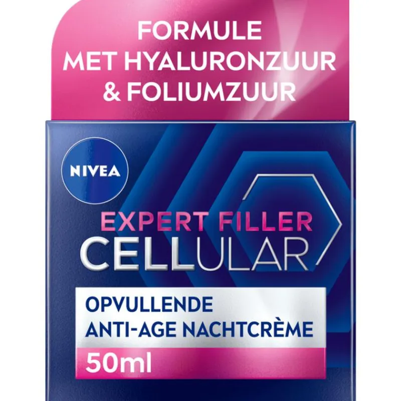 Verzorg en voed de huid met NIVEA CELLular Expert Filler Anti-Age nachtcrème. Deze antirimpelcrème verjongt de huid van binnenuit dankzij een speciale formule die huidveroudering effectief bestrijdt. Bij regelmatig gebruik geniet je van meer stevigheid, terwijl rimpels op een natuurlijke manier worden opgevuld. Gedurende de nacht wordt je huid op intensieve wijze gehydrateerd. ’s Nachts, wanneer je slaapt, is je huid het meest ontvankelijk voor de voedende bestanddelen in deze NIVEA nachtcrème. NIVEA Cellular Expert Filler Anti-Age Nachtcrème 50ml biedt 24 uur lang* een vullende werking voor een jonger uitziende huid. Met hyaluronzuur en collageen hydrateert deze nachtcrème intens en vermindert rimpels. Deze anti-age nachtcrème bevat ook puur foliumzuur, dat op cellulair niveau werkt en de steunvezels van de huid* sterker maakt, wat resulteert in een stevigere en vollere huid. Dermatologisch getest voor huidvriendelijkheid en veiligheid. *in vitro getest • Vult rimpels op natuurlijke wijze met een opvullend effect vanaf 24 uur* • Laat de huid zacht en gehydrateerd aanvoelen • Stimuleert de huidvernieuwing • Met collageenboost en hyaluronzuur • Bewezen verbetering van huidstevigheid • Verrijkt met puur foliumzuur voor celvernieuwing, hydratatie en twee varianten hyaluronzuur