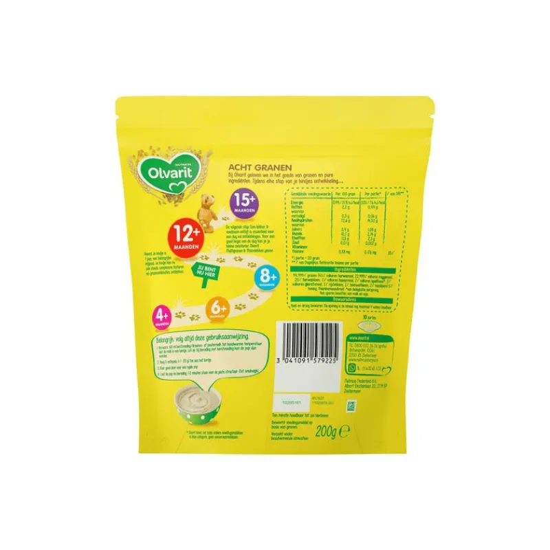 Olvarit acht granen bestaat uit verschillende granen en is hierdoor rijk aan vezels. De pure granen bieden je kindje voedingsstoffen en energie voor een ideaal begin van de dag!