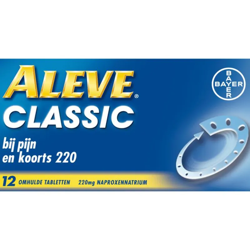 Aleve Classic werkt snel en langdurig tegen pijnen die wat langer kunnen aanhouden, zoals hoofdpijn, griep en verkoudheid, tand- en kiespijn, koorts en bij pijn na vaccinatie. Deze pijnstillers werken ontstekingsremmend en koortsverlagend. De dosering van Aleve Classic, namelijk 220 mg naproxennatrium, is bewezen effectief voor het verlichten van de wat mildere pijnklachten bij, hoofdpijn, griep en verkoudheid, tand- en kiespijn, koorts en bij pijn na vaccinatie. De dosering is maximaal 3 tabletten per dag en maximaal 2 tabletten per dag bij een leeftijd vanaf 65 jaar. Afhankelijk van de intensiteit van de pijn kan worden begonnen met 2 tabletten, na 12 uur kan dan nog 1 tablet worden genomen. Er kan ook voor worden gekozen om om de 8 uur één tablet te nemen. Aleve Classic werkt langer dan Ibuprofen en de kleine, gladde tabletjes zijn gemakkelijk door te slikken. U kunt de tabletten innemen met bijvoorbeeld water en bij voorkeur onmiddellijk na de maaltijd.Aleve Classic 220mg, naproxennatrium: niet te gebruiken bij maag-, darm- en andere bloedingen, maagpijn, gelijktijdig gebruik van antistollingsmiddelen en ernstig hartfalen.