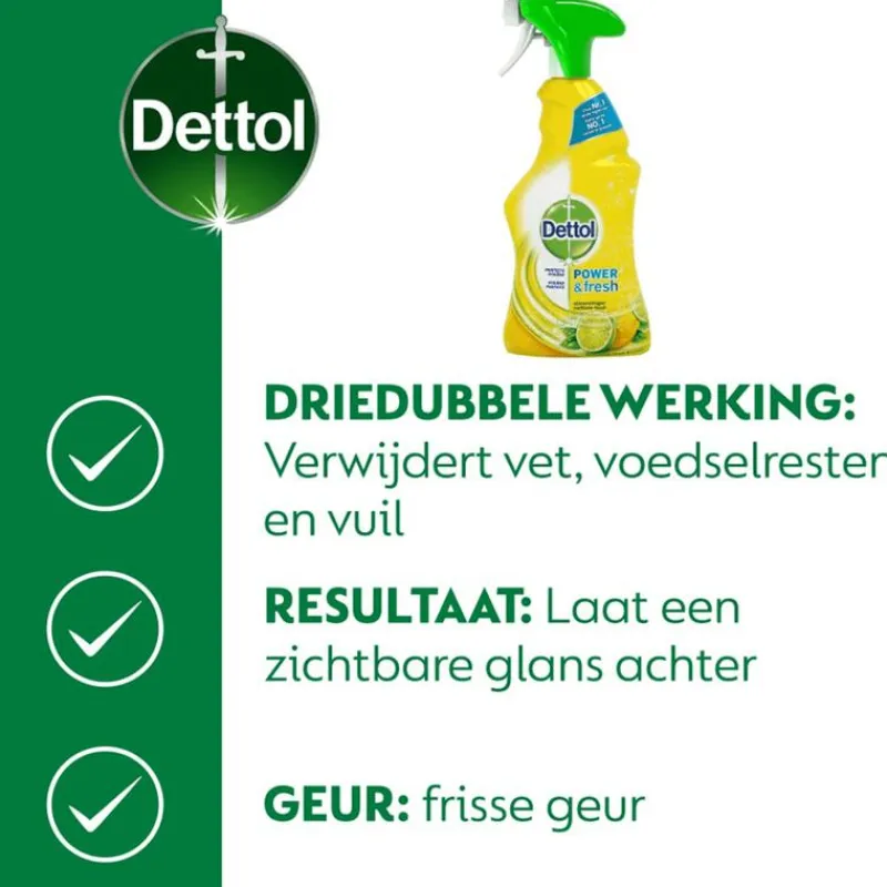 Dettol Antibacteriële Allesreiniger Citroen: verwijdert 99,9% bacteriën, laat glans achter, frisse citrusgeur. Effectief tegen hardnekkige vlekken.