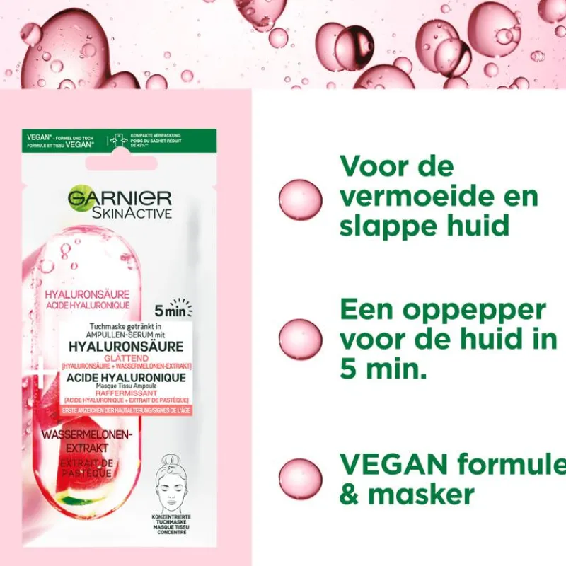 Op zoek naar een boost van je huid, maar zit je krap in tijd? Het hyaluronzuur sheet mask van Garnier met ampullen-serum hydrateert je huid intenstief en maakt deze egaler in slechts 5 minuten. Dit innovatieve gezichtsmasker van Garnier bevat een geconcentreerd ampullen-serum met hyaluronzuur en watermeloen-extract. 1% Hyaluronzuur helpt de huid verlichten en om de natuurlijke glow van jouw huid te herstellen. Watermeloenextract is een dorstlessende superfood die het gezichtsmasker, in combinatie met hyaluronzuur, verstevigend maakt voor de gezichtshuid. De formule van dit gezichtsmasker is effectief voor iedere huid, maar in het bijzonder voor de huid die vermoeid of verslapt aanvoelt.
