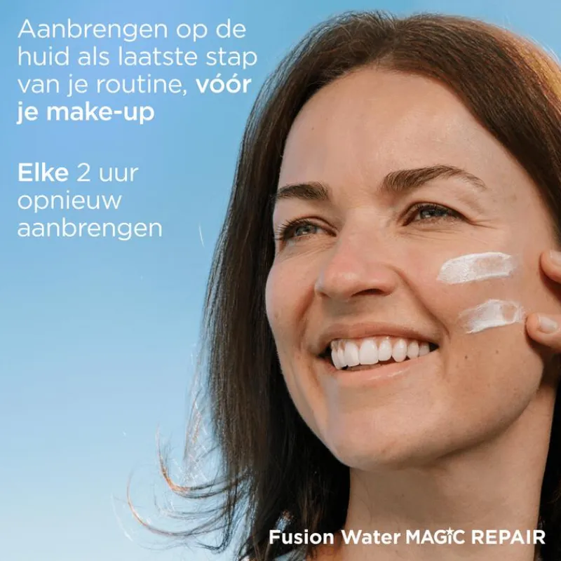 Bescherm uw huid tegen de zon met Fusion Water MAGIC Repair SPF 50, de zonnebrandcrème met ultralichte textuur die drievoudige anti-fotoverouderingswerking biedt. Hydrateert de huid en helpt bij het herstellen van opgehoopte schade door de zon op de huid.