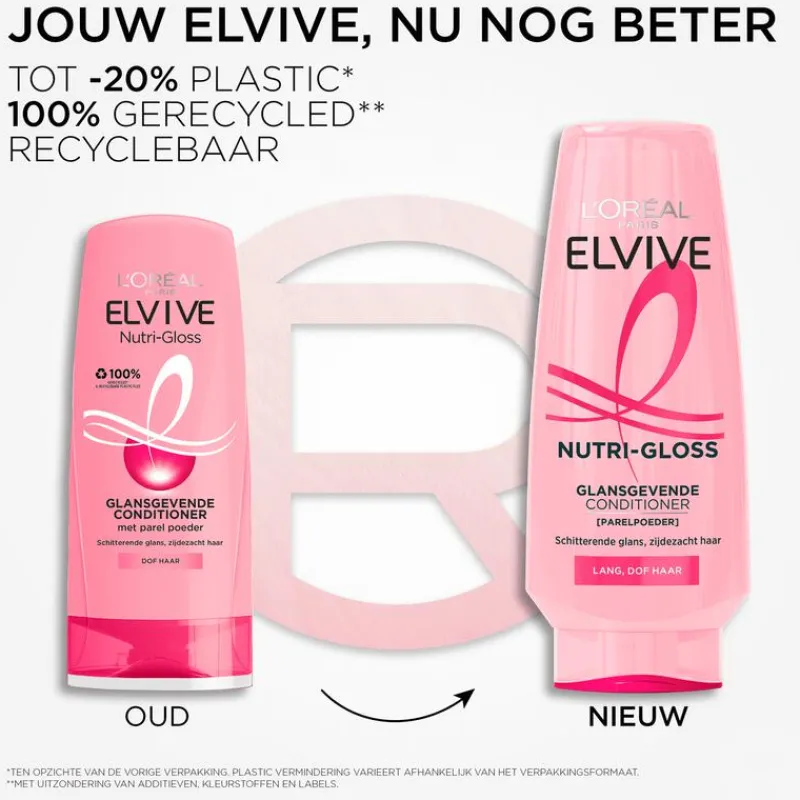 De Elvive Nutri-Gloss Conditioner van L’Oréal Paris voedt, verzacht en laat het haar stralen. De glansgevende conditioner is speciaal ontwikkeld voor lang en dof haar. Hoe langer je haar is, hoe gevoeliger het wordt. Het haar kan na verloop van tijd dof worden: het heeft een gebrek aan glans, vitaliteit en zachtheid. De L’Oréal Paris Elvive Nutri-Gloss Conditioner verrijkt met parelpoeder omhult de haarvezel en maakt het haar weer glanzend en zacht. Jouw Elvive, nu nog beter! De Elvive Nutri-Gloss Conditioner van L’Oréal Paris zorgt voor perfect gevoed en glad haar, dat het licht mooi vangt en weerkaatst. Het haar blijft licht en zacht. Jouw Elvive, nu nog beter! Onze vernieuwde fles is gemaakt met tot -20% minder plastic* en is gemaakt van 100% gerecycled plastic**. Daarnaast is de fles ook recyclebaar. *Ten opzichte van de vorige verpakking. Plastic vermindering varieert afhankelijk van het verpakkingsformaat. **Met uitzondering van de additieven, kleurstoffen en labels.