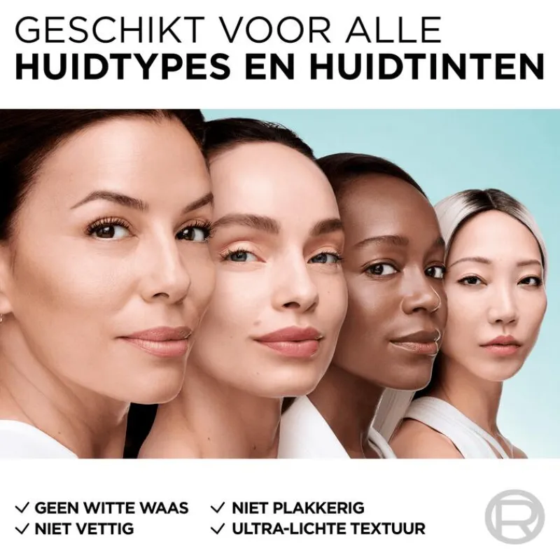 De formule werd dermatologisch getest, laat geen witte waas achter, is niet olieachtig, niet kleverig en heeft een ultralichte textuur. Deze moisturizer is onzichtbaar op alle huidtinten en geschikt voor alle huidtypes, ook voor de gevoelige huid.