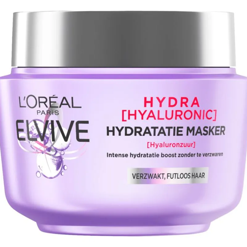 Het L’Oréal Paris Elvive Hydra Hyaluronic Hydratatie Masker is gemaakt met Hyaluronzuur en geeft het haar een intense hydratatie boost door de haarvezel te omsluiten en tot wel 72 uur te hydrateren.