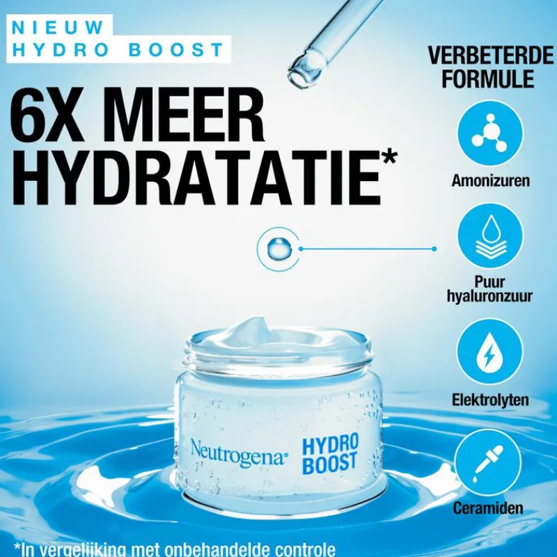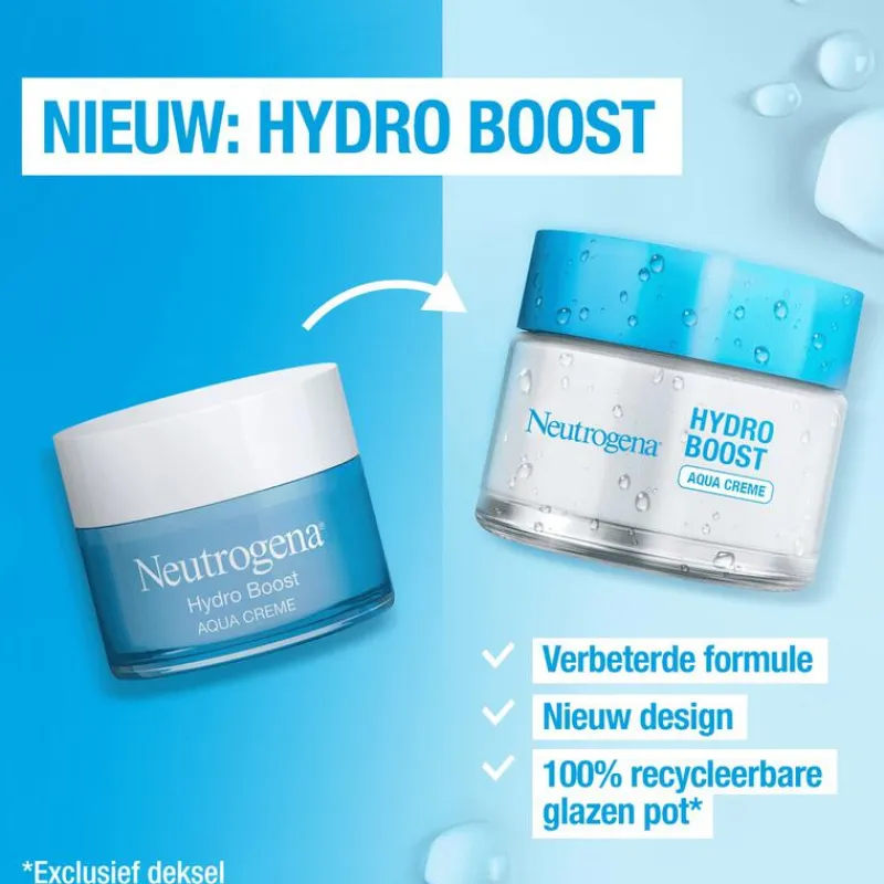 Ontdek nu de nieuwe en verbeterde Hydro Boost formule van Neutrogena! Dankzij de nieuwe formule en hydraterende ingrediënten zoals: aminozuren, elektrolyten, hyaluronzuur en ceramiden wordt de huid tot wel 6x meer gehydrateerd gedurende 72 uur. Dit resulteert in een soepele, gezond uitziende huid met een 80% sterkere huidbarrière.De nieuwe formule bevat 20% meer hyaluronzuur dat helpt vocht vast te houden en de hydratatie te verhogen. Het aminozuur versterkt de huid en zorgt voor extra ondersteuning van de huidbarrière. De elektrolyten bevorderen de opname van de ingrediënten en de ceramiden beschermen en kalmeren de vochtbarrière.De Neutrogena Hydro Boost Gel Crème is vrij van parfum, geschikt voor de droge huid en ontwikkeld in samenwerking met dermatologen. De nieuwe verpakking bevat 87% minder plastic en wordt geleverd in een 100% recyclebare glazen pot. Ontdek nu de nieuwe Neutrogena® Hydro Boost Gel Crème.