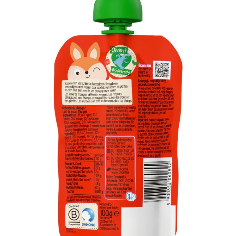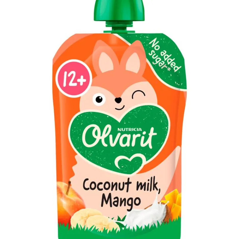 Olvarit 100% Plantaardig Knijpfruit Kokosmelk Mango, geschikt voor baby’s vanaf 12 maanden oud.