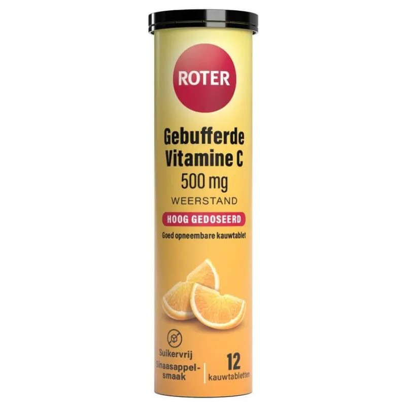 Roter Gebufferde Vitamine C ondersteunt de natuurlijke weerstand. Dankzij de gebufferde formule wordt de zuurbelasting op de maag verminderd, hierdoor is deze hooggedoseerde kauwtablet milder voor de maag en de darmen, wat prettig kan zijn bij hogere dosering of voor mensen met een gevoelige maag. De goed opneembare kauwtabletten hebben een lekkere sinaasappelsmaak en zijn geschikt voor dagelijks gebruik. De tabletten zijn glutenvrij, suikervrij, lactosevrij en bevatten vegan ingrediënten.