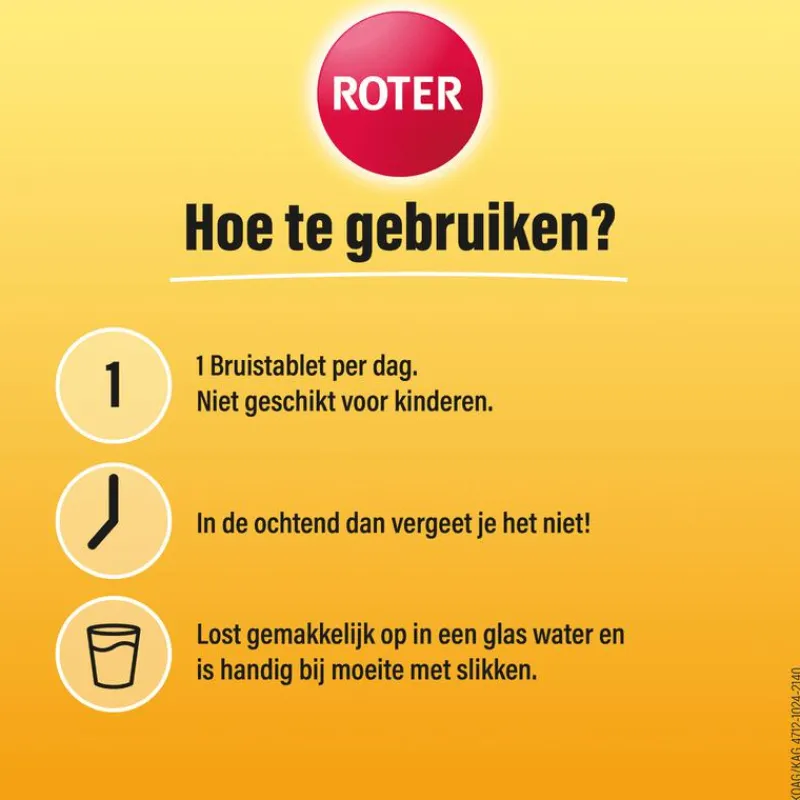 Roter 1000 mg vitamine C Bruis zijn bruistabletten. Het vitamine C bruistablet oplossen in een glas water en direct opdrinken. Aanbevolen dosering is 1 bruistablet per dag. Houd je aan de aanbevolen dosering. Voedingssupplementen in de vorm van extra vitamine C zijn geen vervanging van je dagelijkse voeding.