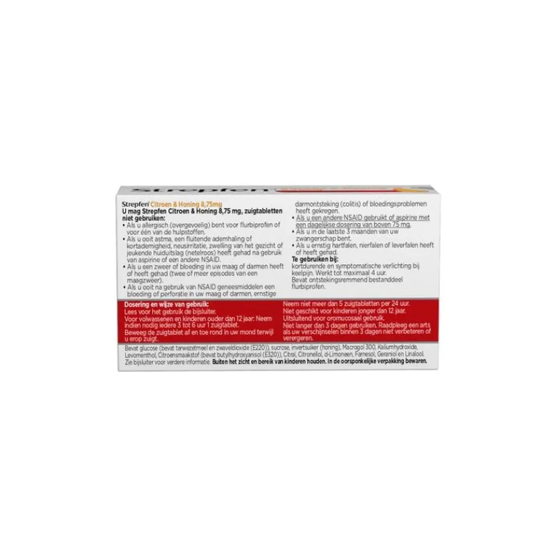 Niet gebruiken bij allergie voor één van de stoffen in dit geneesmiddel. Overgevoeligheid voor NSAID’s, maag-/darmzweer, hart-, nier- of leverfalen, bloedstollings- of bloedingsproblemen. Laatste 3 mnd zwangerschap.,Indicatie: Het verlichten van keelklachten zoals keelpijn en zwelling.