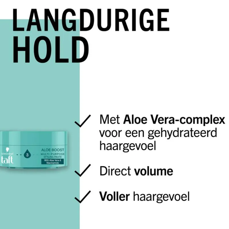 Taft Aloe Boost Multi-Purpose Styling Paste geeft het haar langdurige hold, een voller haargevoel en direct volume.