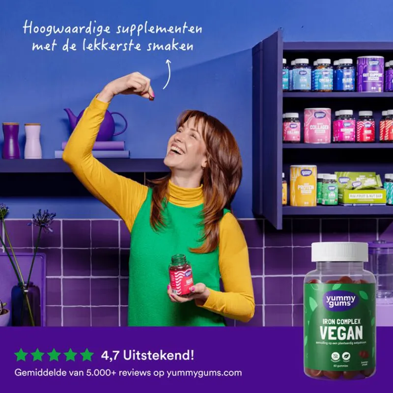 Met Yummygums Vegan Iron Complex ondersteun je jouw vega(n) dieet. Dankzij de lekkere bramensmaak houd je die vitamineroutine makkelijk vol. Yummygums Vegan Iron Complex is plant-based en suikervrij.