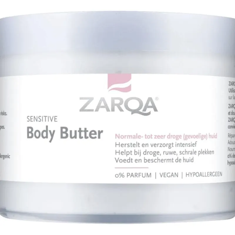 Zarqa Body Butter is een intensief verzorgende crème die de droge, geprikkelde en (zeer) gevoelige huid voedt en beschermt. Ruwe huid, schrale plekken en schilfers worden weer zacht en glad. Het kalmeert de huid en trekkerigheid verdwijnt. Het herstelt de verstoorde vochtbalans en de natuurlijke beschermingslaag van de huid. Verzacht bij kloofjes. Geschikt voor het hele gezin.