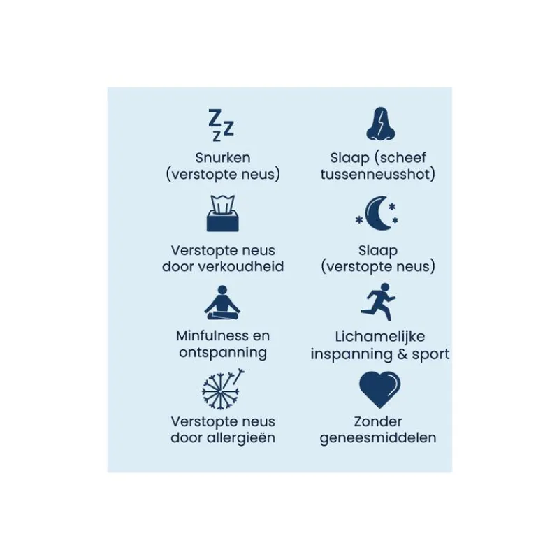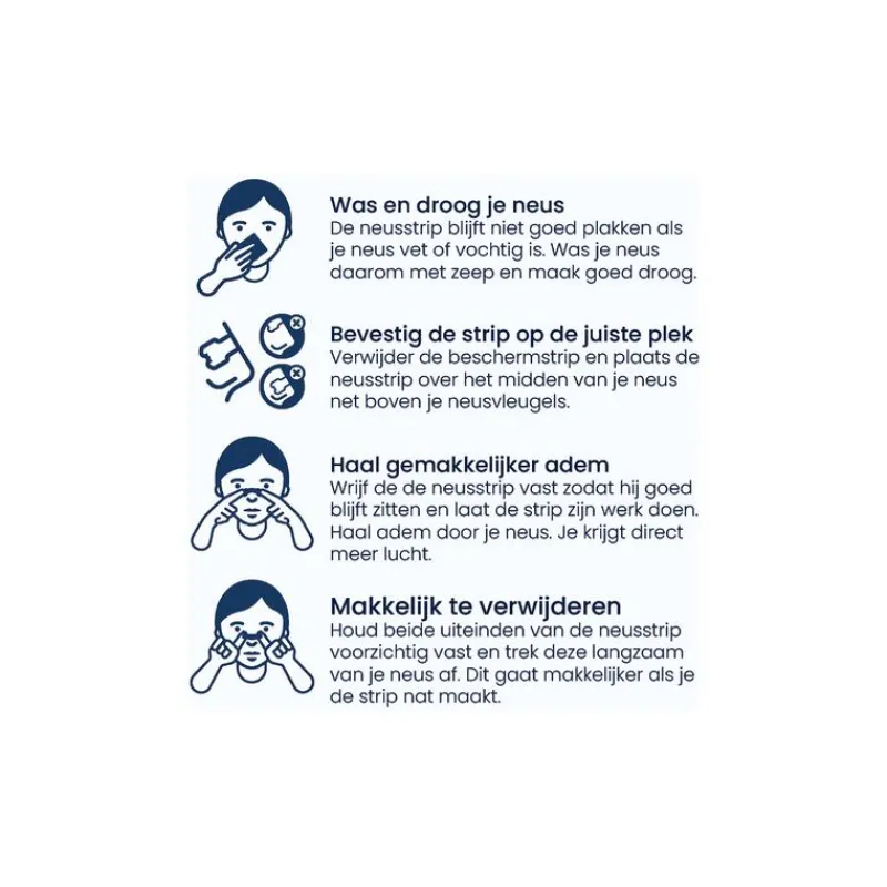 De huidvriendelijke kleefstrip bevat twee buigzame strookjes, waarmee je de strip eenvoudig over de neusbrug plakt. De strip tilt de neusvleugels extra stevig op, waardoor de neusgangen zich openen en je direct meer lucht krijgt. Deze verbeterde luchtstroom kan snurken door een verstopte neus helpen verminderen of zelfs helemaal laten verdwijnen.