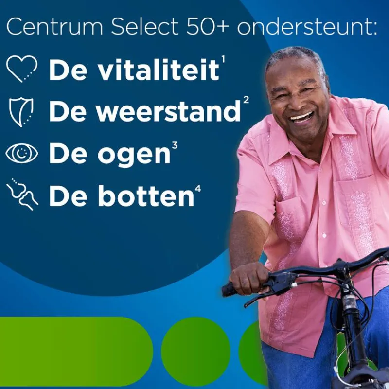 Centrum Select 50+ is een compleet multivitamine & mineralen supplement, speciaal ontwikkeld om de voedingsbehoeften van mannen en vrouwen vanaf 50 jaar te ondersteunen. Naar mate we ouder worden, veranderen onze voedingsbehoeften. Zo heeft je lichaam minder energie uit voeding nodig voor de opbouw en het onderhoud van het lichaam, maar worden bepaalde voedingsstoffen steeds belangrijker. Centrum Select 50+ bevat belangrijke micronutriënten om de vitaliteit, weerstand, ogen en botten te ondersteunen. Bevat vitamine B6, B12 en ijzer ter ondersteuning van het energieniveau en bevat vitamine C, seleen en zink om het immuunsysteem te ondersteunen. De conditie van het oog wordt ondersteund door het gehalte aan vitamine A en B2 en de botten worden ondersteund door de calcium, vitamine D en K die aan de formule zijn toegevoegd.Gluten- en lactosevrij en geschikt voor diabetici.