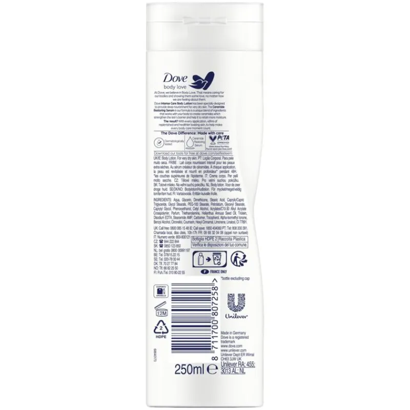 Met Dove Body Love Intense Care Bodylotion geef je jezelf diepe voeding voor een herstelde en gezond uitziende huid. Bescherming tegen een zeer droge huid begint met je huid de zorg te geven die het verdient. Dove Body Love Intense Care Bodylotion is geformuleerd met een uniek Ceramide Restoring Serum. Deze mix van ingrediënten werkt samen met je lichaam om natuurlijke ceramiden te creëren. Dit helpt het huidoppervlak van binnenuit af te sluiten en de barrière te versterken om vochtverlies te voorkomen. Dove weet dat een zeer droge huid lastig kan zijn en het is niet altijd gemakkelijk om je huid er op zijn best uit te laten zien. Maar het is niet nodig om op te geven. Met een snel absorberende formule helpt Dove Body Love Intense Care Body Lotion de zeer droge huid te transformeren in een langblijvende zachte, gladde en stralende huid. De verzorging van een zeer droge huid begint met het juiste niveau van voeding van een bodylotion die de huid de hele dag gehydrateerd houdt. Dove Body Love Intense Care Body Lotion houdt tot 48 uur vocht vast diep* in het huidoppervlak, waardoor de huid hersteld en zacht aanvoelt.