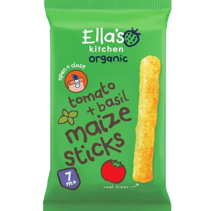 100% biologische babyvoeding. Gepofte maïs sticks met tomaat + basilicum. De perfecte grootte + vorm om kleintjes te leren om hun eigen eten te pakken en smelt in kleine mondjes! Vanaf 7 maanden.