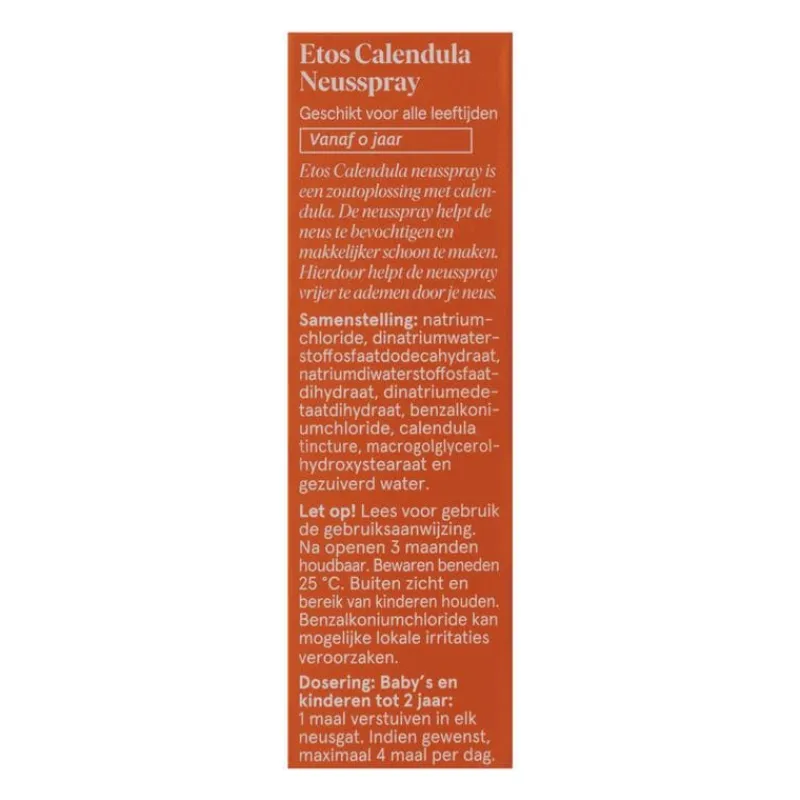 Etos Calendula Neusspray is een isotone oplossing, met een zoutgehalte dat geschikt is om het neusvlies te reinigen.Etos Calendula Neusspray kan worden gebruikt om: • De neus te bevochtigen wanneer ze droog is bij geringe luchtvochtigheid (bijvoorbeeld in verwarmde ruimtes of ruimtes met airconditioning, bij grote hoogte, vliegreizen). • Het neusslijmvlies zachtjes te reinigen zodat de baby of het kind vrijer kan ademen.