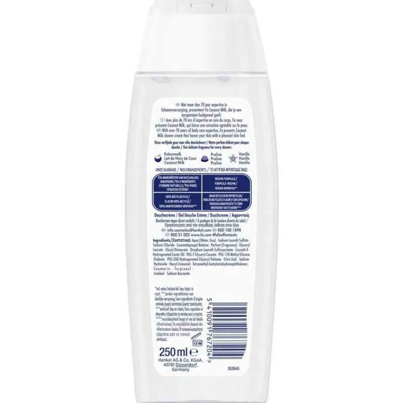 Ontdek Fa Coconut Milk douchecrème met de heerlijke geur van kokosmelk. De formule bevat 95% ingrediënten van natuurlijke oorsprong (incl. water).