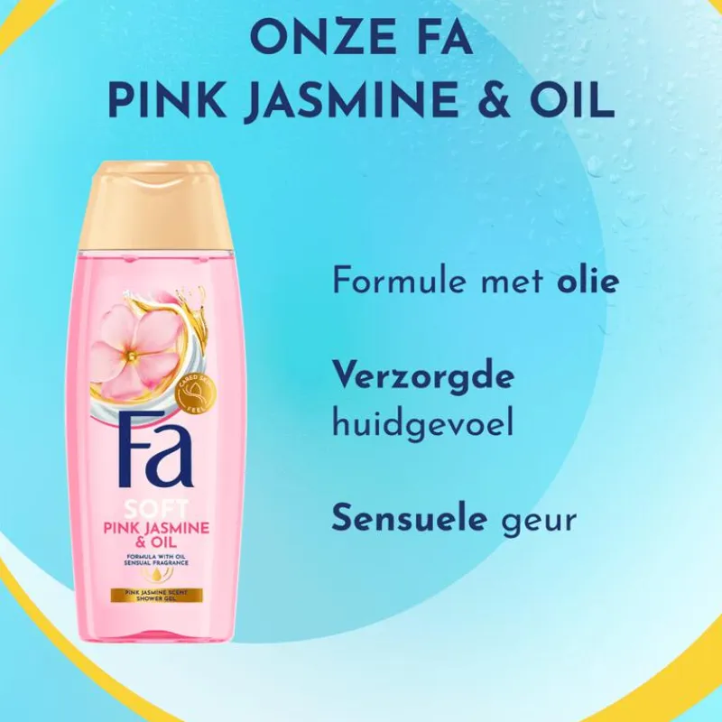 De formule van de Fa Pink Jasmine & Oil douchegel is pH-huidneutraal. Zet de fles op z’n dop voor gebruik tot de laatste druppel.