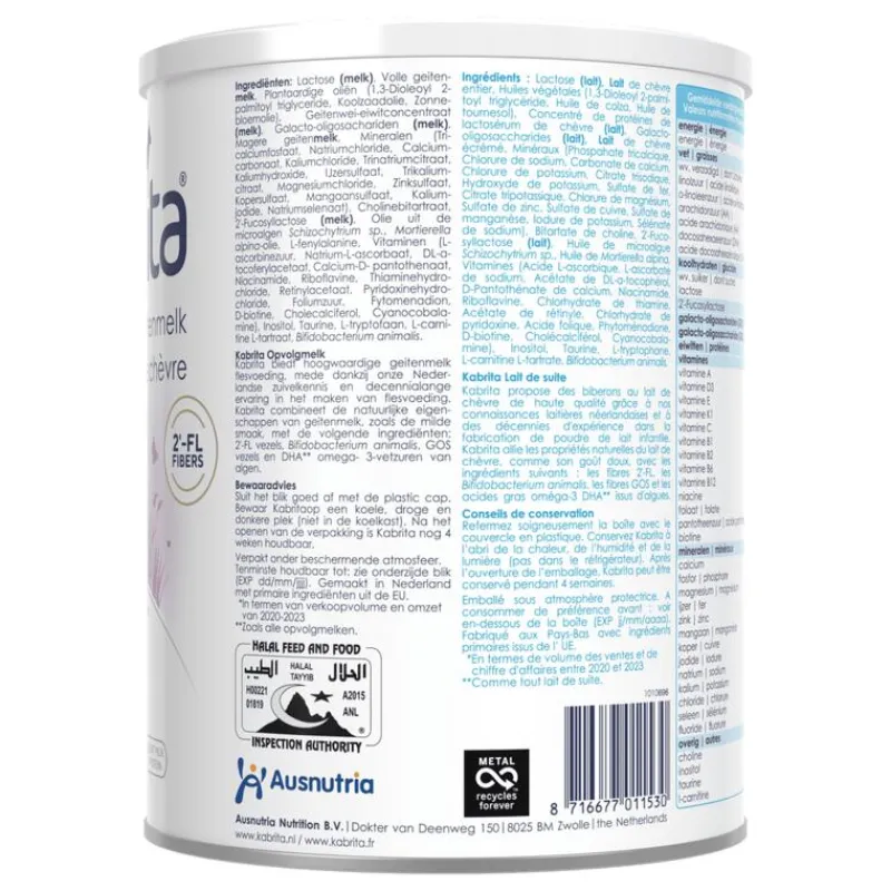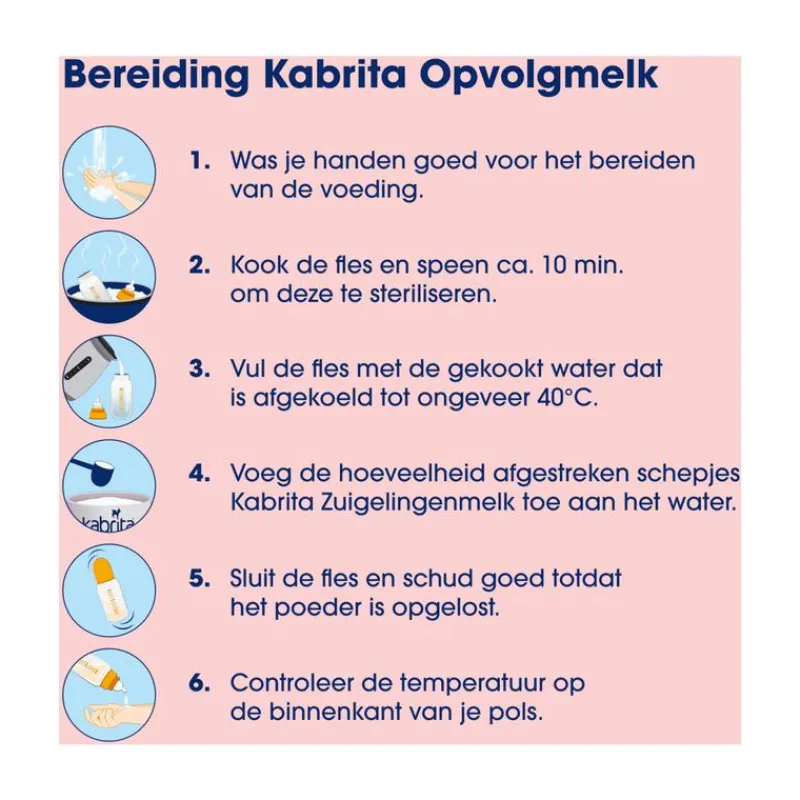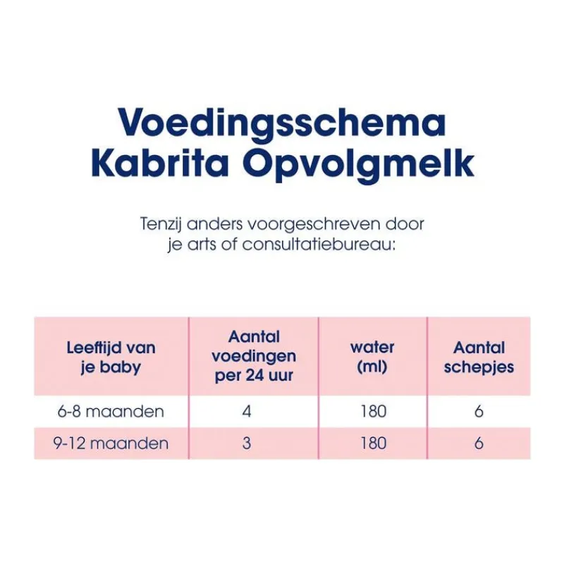 Verpakt onder beschermende atmosfeer.Borstvoeding is de meest geschikte voeding voor je baby. Voor de gezondheid van je baby is het belangrijk zorgvuldig de bereidingsinstructies op het blik te volgen. Kabrita Opvolgmelk (6-12 maanden) mag niet gebruikt worden in de eerste 6 maanden als vervanging van borstvoeding. Kabrita Opvolgmelk is geschikt vanaf de leeftijd van 6 maanden en is onderdeel van een gevarieerde voeding.