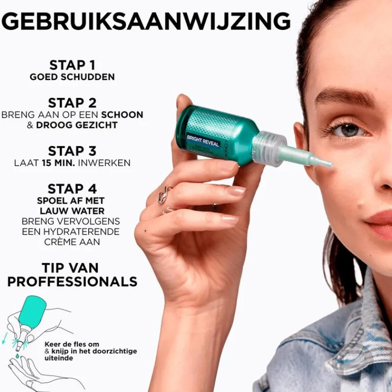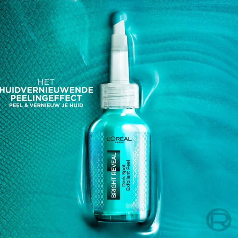 L’Oréal Paris Bright Reveal Dark Spot Exfoliant Peel is een peeling die een snelle werking biedt bij alle soorten pigmentvlekken, inclusief post-acne vlekken, zonnevlekken, hormonale vlekken en ouderdomsvlekken. De met niacinamide en 25% exfoliërende zuren (AHA’s, BHA’s en PHA’s) verrijkte formule biedt een huidvernieuwend peelingeffect, vermindert poriën en oneffenheden, gaat hyperpigmentatie zichtbaar tegen en zorgt voor een verhelderend effect waardoor je huid egaler en vitaler oogt. De olievrije, op professionele peelings gebaseerde formule is gevalideerd door dermatologen, getest op alle huidtinten en geschikt voor alle huidtypes, zelfs de gevoelige huid.