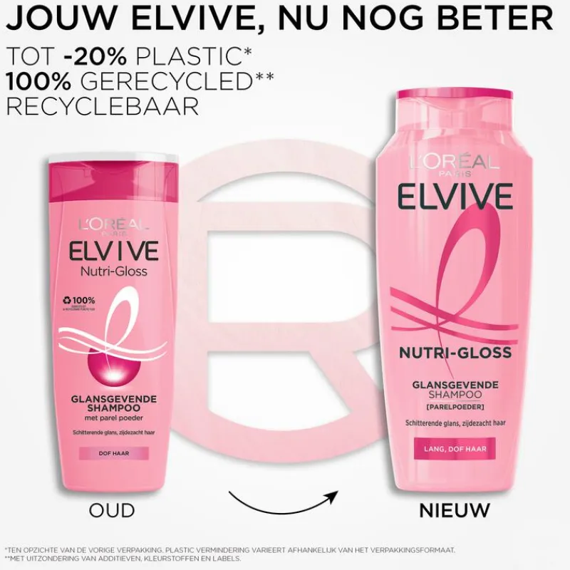 De ElviveNutri-Gloss Shampoo van L’Oréal Paris voedt, verzacht en revitaliseert het haar voor een glanzend zijdezacht gevoel. De glansgevende shampoo is speciaal ontwikkeld voor lang en dof haar. Hoe langer je haar is, hoe gevoeliger het wordt. Het haar kan na verloop van tijd dof worden: het heeft een gebrek aan glans, vitaliteit en zachtheid. De L’Oréal Paris ElviveNutri-Gloss Shampoo verrijkt met parelpoeder reinigt, omhult de haarvezel en maakt het haar weer schitterend glanzend en zijdezacht. De ElviveNutri-Gloss Shampoo van L’Oréal Paris zorgt voor perfect gevoed en glad haar, dat het licht mooi vangt en weerkaatst. Het haar blijft licht en zacht. Jouw Elvive, nu nog beter! Onze vernieuwde fles is gemaakt met tot -20% minder plastic* en is gemaakt van 100% gerecycled plastic**. Daarnaast is de fles ook recyclebaar. *Ten opzichte van de vorige verpakking. Plastic vermindering varieert afhankelijk van het verpakkingsformaat. **Met uitzondering van de additieven, kleurstoffen en labels.