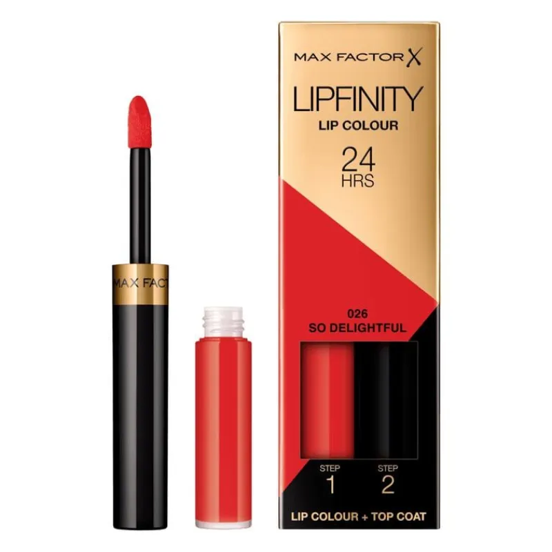 Max Factor Lipfinity Lip Colour 2-Step Long Lasting Lippenstift is een langhoudende vloeibare lippenstift die ervoor zorgt dat jouw lippen tot wel 24 uur worden voorzien van een prachtige kleur. Het geheim van de Max Factor lipstick zit hem in de twee stappen. Stap 1: Breng de Lipfinity Lip Colour aan op schone, droge lippen. Stap 2: Om de lippen te hydrateren en glans toe te voegen, breng vervolgens de transparante en vochtinbrengende topcoat aan.