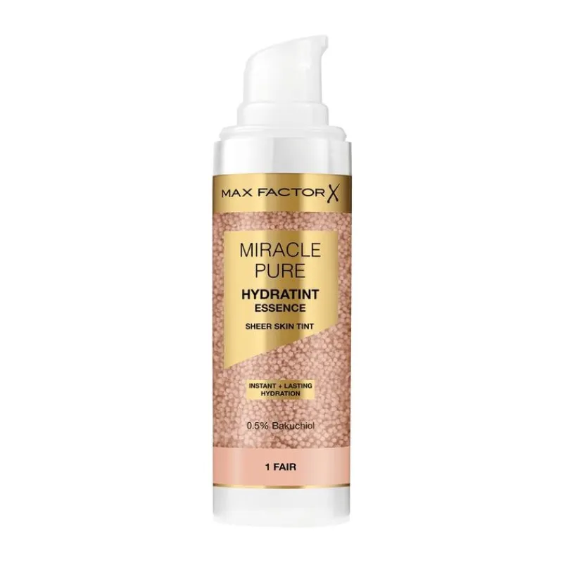 Max Factor Miracle Pure Hydratint Essence, de miraclemaker in huidverzorging voor make-upartiesten. Dit product geeft de huid een sterke hydratatieboost, waarna ze heerlijk fris aanvoelt en tot wel 24 uur lang optimaal gehydrateerd blijft. De vegan formule bestaat voor 71% uit water en is voor 0,5% verrijkt met bakuchiol en in microbolletjes ingekapselde kleurpigmenten. De formule is makkelijk te blenden en zorgt voor een stralend en toch heel natuurlijk dekkend kleurresultaat. Deze helder stralende getinte huidverzorging verbetert de veerkracht van de huid; een klinisch bewezen effect na 14 dagen gebruik!